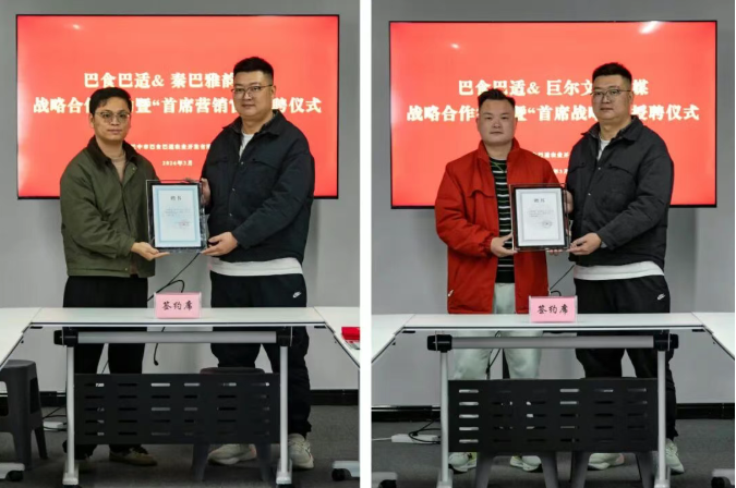 簽約環(huán)節(jié),市巴食巴適公司分別與秦巴雅韻公司、巨爾文化傳媒公司簽署戰(zhàn)略合作協(xié)議,建立為期三年的戰(zhàn)略合作關(guān)系,在品牌文化挖掘、文創(chuàng)產(chǎn)品開發(fā)、全媒體傳播矩陣建設(shè)等領(lǐng)域展開深度合作。簽約后,市巴食巴適公司負(fù)責(zé)人何九江為李泓江、郭有成頒發(fā)聘書。李泓江正式受聘擔(dān)任“首席營(yíng)銷官”,負(fù)責(zé)品牌整體營(yíng)銷運(yùn)營(yíng),為品牌注入人文內(nèi)涵,打造有溫度、有深度的品牌形象;郭有成正式受聘擔(dān)任“首席戰(zhàn)略官”,負(fù)責(zé)公司直播帶貨整體運(yùn)營(yíng),為品牌全媒體矩陣建設(shè)及市場(chǎng)拓展提供戰(zhàn)略支撐。