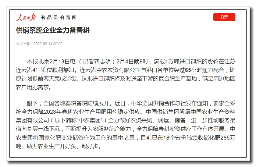 眼下,全國(guó)各地春耕備耕陸續(xù)展開(kāi)。近日,中華全國(guó)供銷(xiāo)合作總社發(fā)布通知,要求全系統(tǒng)全力保障2023年春耕農(nóng)業(yè)生產(chǎn)用肥用藥穩(wěn)定供應(yīng)。中國(guó)供銷(xiāo)集團(tuán)所屬中國(guó)農(nóng)業(yè)生產(chǎn)資料集團(tuán)有限公司(以下簡(jiǎn)稱“中農(nóng)集團(tuán)”)全力做好農(nóng)資采購(gòu)、調(diào)運(yùn)、儲(chǔ)備,進(jìn)一步推動(dòng)服務(wù)渠道向基層一線下沉,不斷提升為農(nóng)服務(wù)綜合能力,全力保障春耕農(nóng)資供應(yīng)工作有序開(kāi)展。中農(nóng)集團(tuán)將國(guó)家化肥商業(yè)儲(chǔ)備作為工作的重中之重,目前已在18個(gè)省份陸續(xù)收儲(chǔ)化肥265萬(wàn)噸,助力農(nóng)業(yè)生產(chǎn)開(kāi)好頭、起好步。
