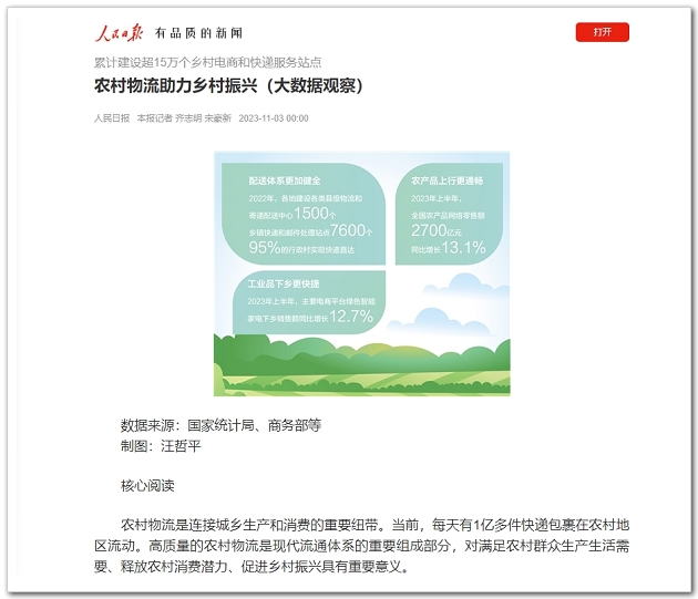 今年初,《中共中央 國務(wù)院關(guān)于做好2023年全面推進(jìn)鄉(xiāng)村振興重點(diǎn)工作的意見》提出,加快完善縣鄉(xiāng)村電子商務(wù)和快遞物流配送體系,建設(shè)縣域集采集配中心,推動(dòng)農(nóng)村客貨郵融合發(fā)展,大力發(fā)展共同配送、即時(shí)零售等新模式,推動(dòng)冷鏈物流服務(wù)網(wǎng)絡(luò)向鄉(xiāng)村下沉。
