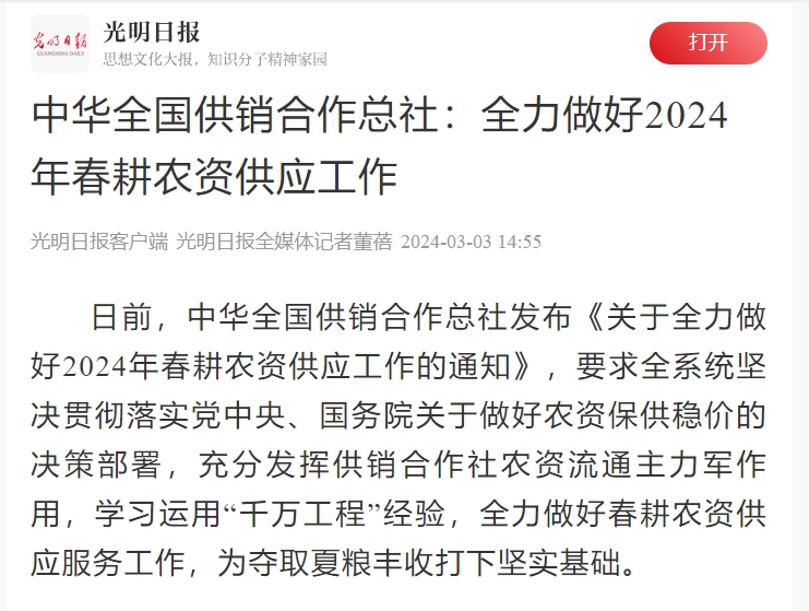 日前,中華全國(guó)供銷合作總社發(fā)布《關(guān)于全力做好2024年春耕農(nóng)資供應(yīng)工作的通知》,要求全系統(tǒng)堅(jiān)決貫徹落實(shí)黨中央、國(guó)務(wù)院關(guān)于做好農(nóng)資保供穩(wěn)價(jià)的決策部署,充分發(fā)揮供銷合作社農(nóng)資流通主力軍作用,學(xué)習(xí)運(yùn)用“千萬工程”經(jīng)驗(yàn),全力做好春耕農(nóng)資供應(yīng)服務(wù)工作,為奪取夏糧豐收打下堅(jiān)實(shí)基礎(chǔ)。