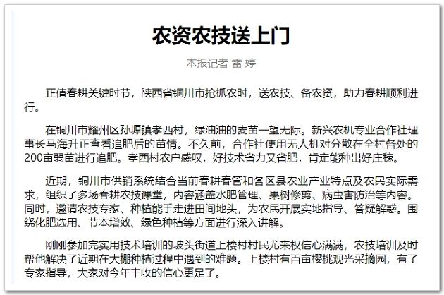 銅川市供銷合作社黨組成員、副主任王婧表示,當(dāng)?shù)毓膭?lì)各區(qū)縣供銷合作社以農(nóng)資供應(yīng)為抓手,充分調(diào)動(dòng)各方資源,推廣“農(nóng)資供應(yīng)+農(nóng)技培訓(xùn)+農(nóng)產(chǎn)品購(gòu)銷+農(nóng)業(yè)社會(huì)化服務(wù)”的一體化為農(nóng)服務(wù)模式,將服務(wù)觸角延伸到耕、種、管、收等農(nóng)業(yè)生產(chǎn)全過(guò)程。銅川市供銷合作社還充分發(fā)揮農(nóng)資供應(yīng)主渠道作用,引導(dǎo)農(nóng)資經(jīng)營(yíng)主體加強(qiáng)市場(chǎng)調(diào)查與分析預(yù)測(cè),把握市場(chǎng)趨勢(shì),多渠道組織貨源,做好化肥、農(nóng)藥、農(nóng)膜等春耕生產(chǎn)物資的采購(gòu)、調(diào)運(yùn)和供應(yīng)工作。
